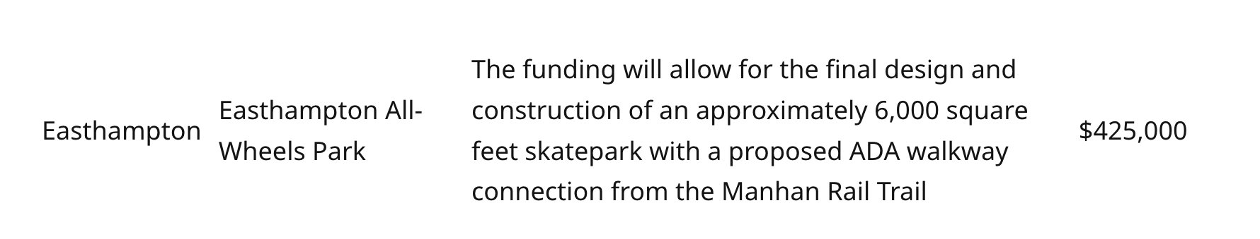 Easthampton Community Preservation Act Committee approved $250,000 towards the skatepark at Millside Park.